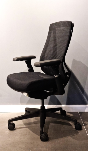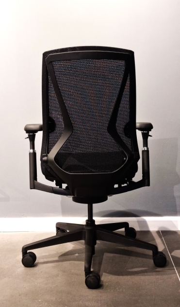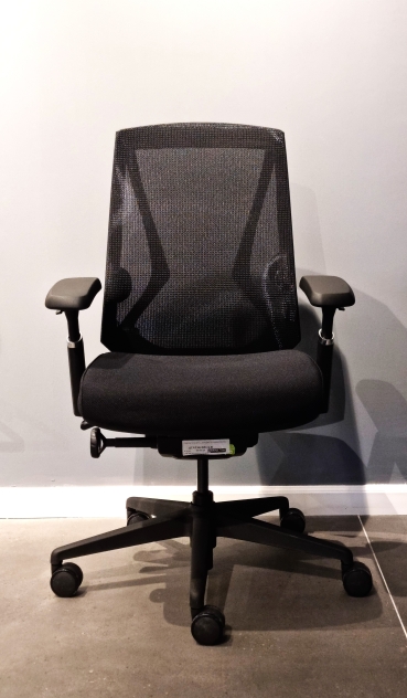 - מושב מרופד בבד בגוון שחור ומשענת גב ברשת בגוון שחור.