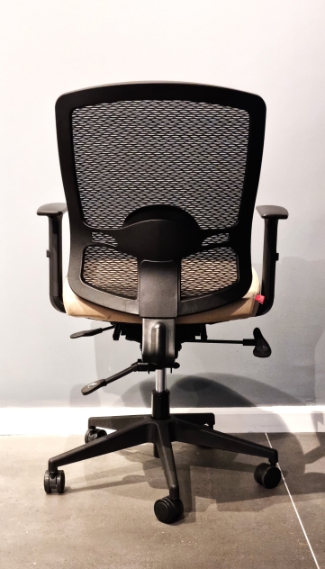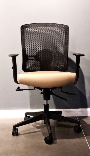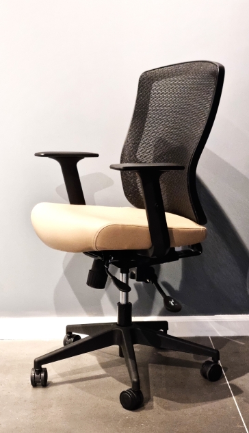 - מושב מרופד בבד דמוי עור איגותי בגוון בז' ומשענת גב ברשת בגוון שחור.
